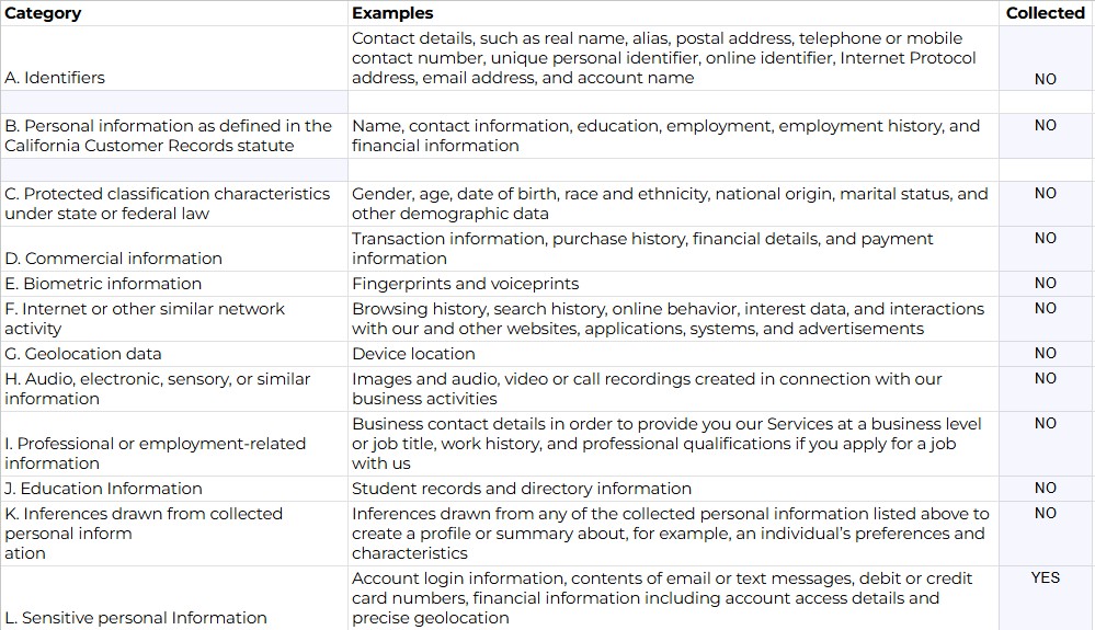 We only collect sensitive personal information, as defined by applicable privacy laws or the purposes allowed by law or with your consent. Sensitive personal information may be used, or disclosed to a service provider or contractor, for additional, specified purposes. You may have the right to limit the use or disclosure of your sensitive personal information. We do not collect or process sensitive personal information for the purpose of inferring characteristics about you.